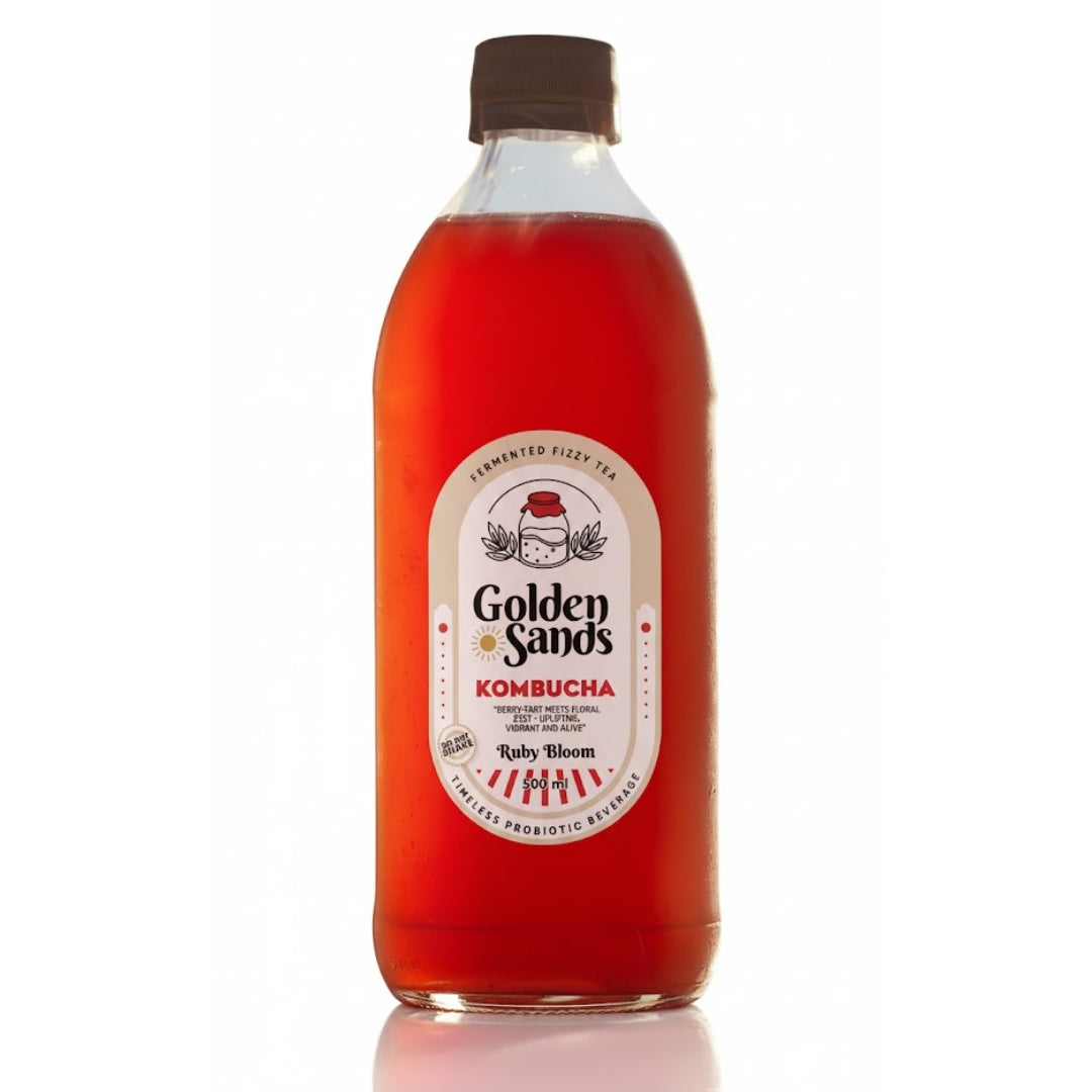 Golden Sands Ruby Bloom Kombucha is an uplifting, fruit-forward blend where berry tartness meets floral zest. Crafted with locally sourced strawberries, pomegranate, lemon, and hibiscus from organic farms in Los Cabos, each bottle captures the vibrant essence of Baja. The result is a refreshing, effervescent kombucha that balances sweet, tangy, and floral notes in perfect harmony.