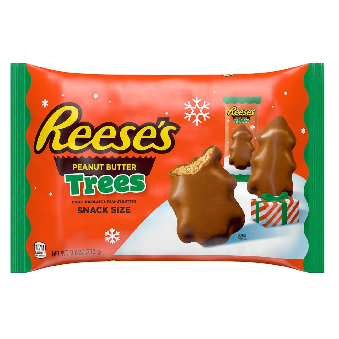 A holiday twist on the classic favorite — creamy peanut butter wrapped in smooth milk chocolate shaped like Christmas trees.