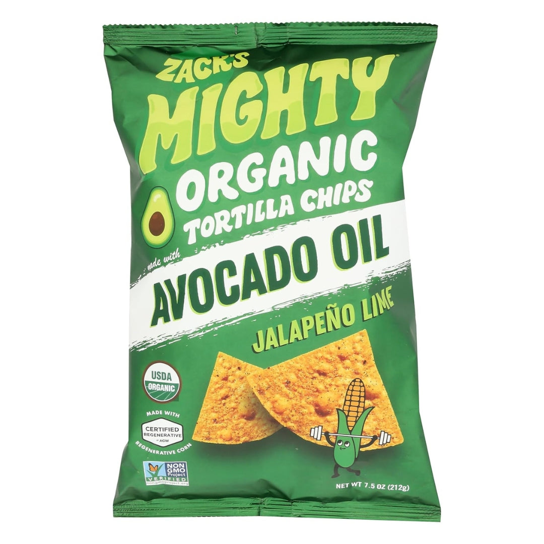 Zack’s Mighty Organic Avocado Oil Tortilla Chips in Jalapeño Lime flavor deliver a zesty, spicy crunch made from organic corn and cooked in smooth avocado oil. Each bite combines the tang of lime with the bold kick of jalapeño, creating a perfect balance for snacking or pairing with your favorite dip.