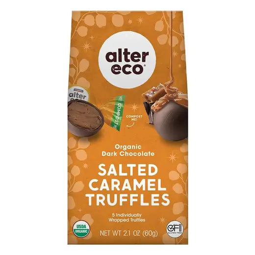 Rich organic dark chocolate truffles filled with soft, golden caramel. Ethically sourced and beautifully wrapped for the holidays.