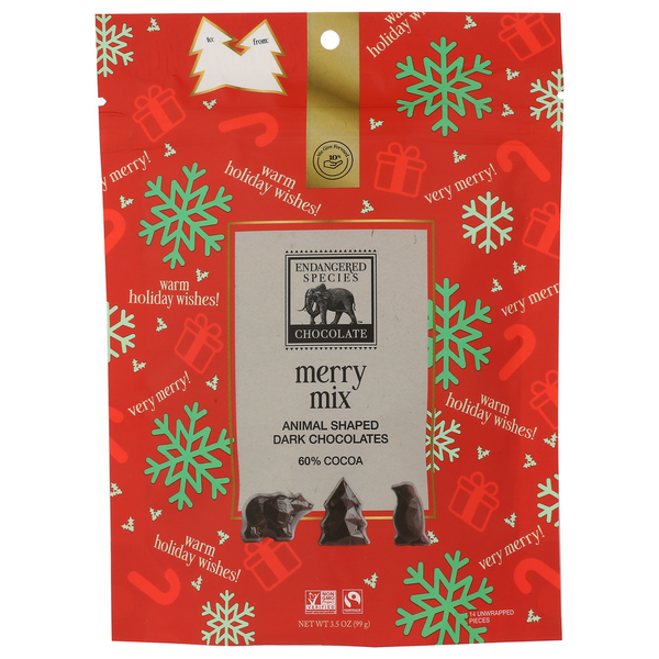 A festive dark chocolate bar made with responsibly sourced cocoa and topped with bright holiday inclusions. Indulgence with a purpose — supporting wildlife conservation in every bite.